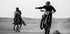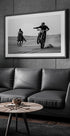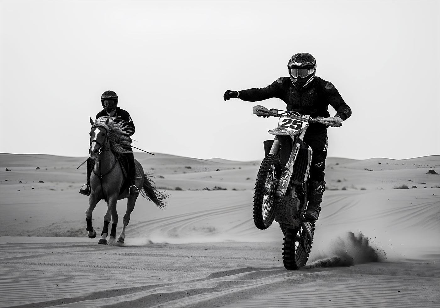 En dramatisk sort-hvid plakat, der indfanger kontrasten mellem menneske, maskine og natur — en motocrosskører, der kappes med en galopperende hest gennem ørkenen. Dette dynamiske fotografi udstråler fart, styrke og frihed, ideelt til moderne og maskuline hjem.