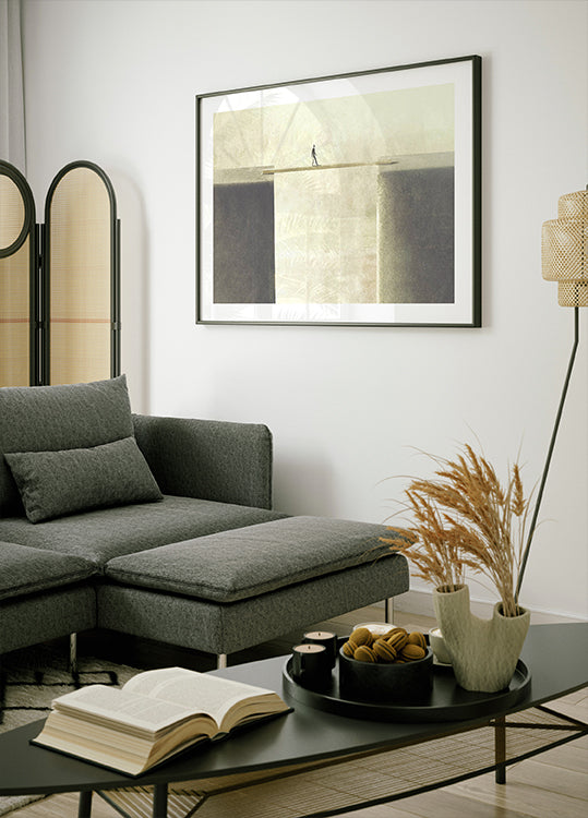 Et moderne konceptuelt værk der viser en figur, der balancerer over en smal planke mellem to klipper. Kunstværket udtrykker mod, forandring og den skrøbelige vej mod personlig udvikling.