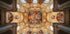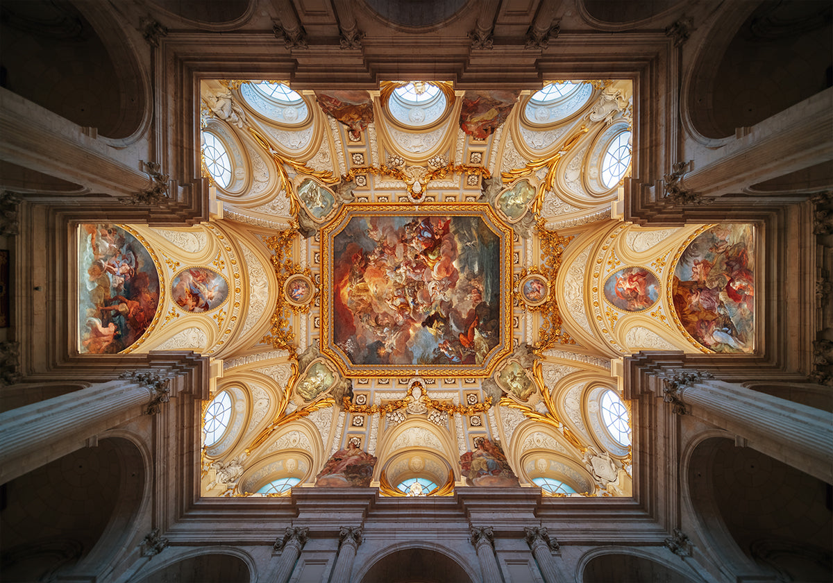 Et majestætisk blik op i et kongeligt palads i Madrid: forgyldte detaljer, barokke ornamenter og streng geometrisk symmetri mødes i en hypnotisk komposition. Den dramatiske perspektivflugt leder øjet mod midtpunktet og indfanger storhed og historie i ét øjeblik. Fotografi af Juan Pablo de Miguel. Perfekt for arkitektur-elskere.