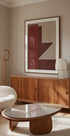 En moderne, minimalistisk plakat med geometriske former i dybe røde og burgunder nuancer. Skarpe linjer og overlappende flader skaber rytme og balance, mens en diskret, tekstureret baggrund giver dybde. Et grafisk statement, der tilfører varme, ro og kant til både stue, kontor eller entré. Perfekt til en nordisk indretning.