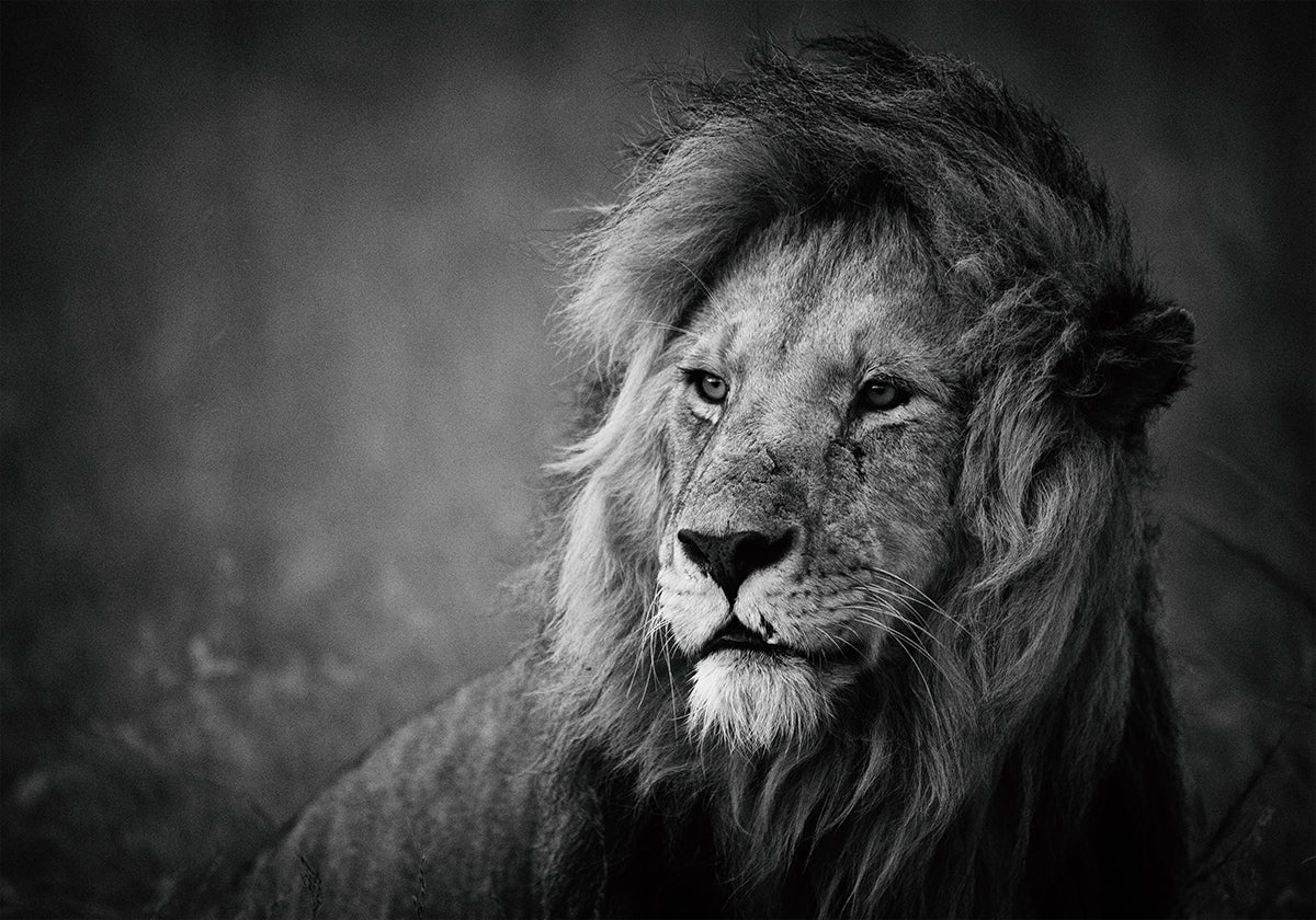 Regal af Mohammed Alnaser fanger savannens konge i dramatisk sort/hvid. En majestætisk løve træder frem af mørket, vinden løfter manken, og blikket er fokuseret og værdigt. Den low-key belysning og diskrete vignette skaber dybde og ro – et ikonisk, kraftfuldt portræt til vægge med karakter. Perfekt i stue, kontor eller kreative rum.