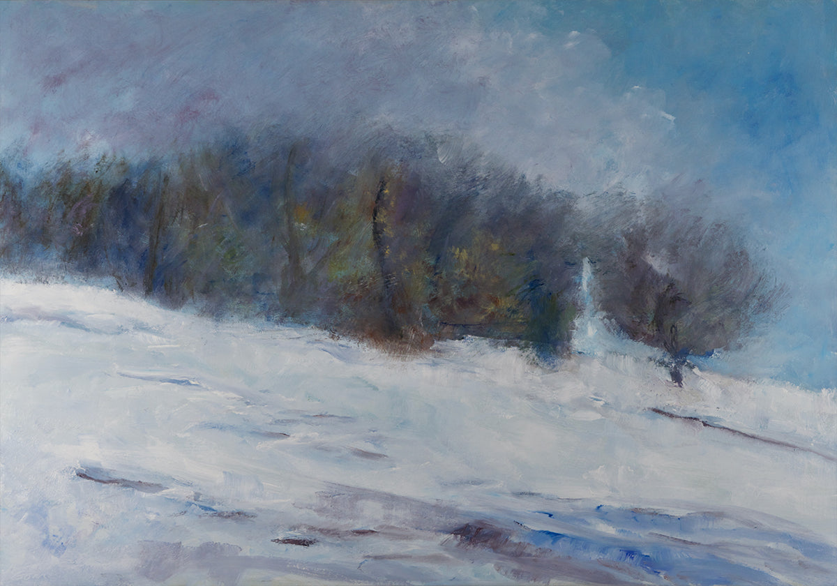 Ridge Line af Richard Gombar skildrer en abstrakt vinterkam i blå toner: tunge skyer, drivende sne og mørke skovbryn, der glider sammen til en stemning af ro og spænding. Vinden visker konturerne ud, og diskrete spor antyder langrendets rute gennem det tyste, vidtstrakte landskab. Et moderne, impressionistisk vintermotiv til hjemmet.