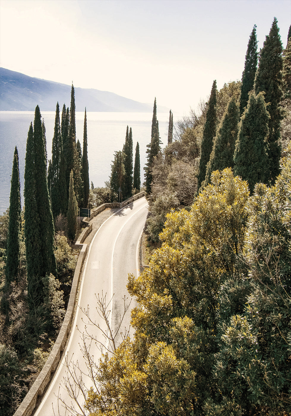 En naturskøn snoet vej omgivet af høje cypresser og frodigt grønt nær bredden af Gardasøen i Italien. Det glitrende vand strækker sig mod horisonten og reflekterer det lyse sollys og de fjerne bakker. Dette stemningsfulde billede indfanger den italienske søcharme og inviterer til at udforske Gardasøens rolige skønhed.