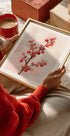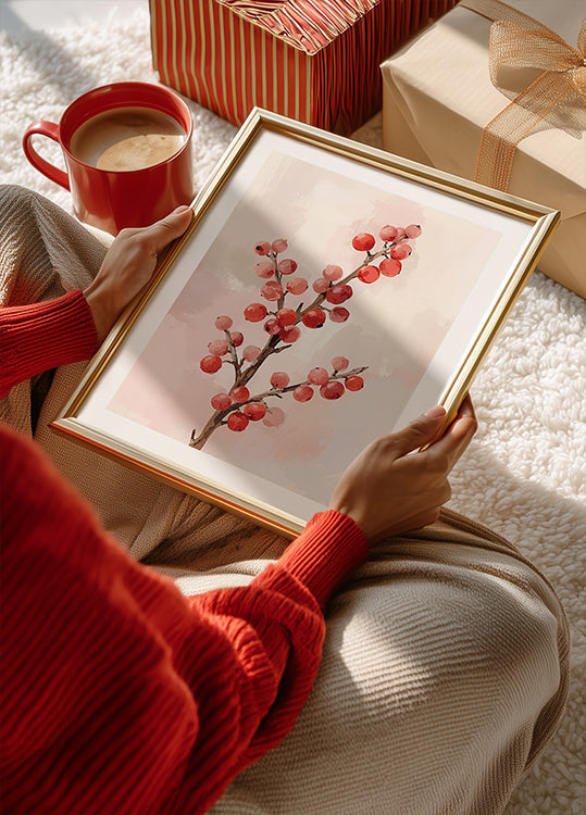 Roter Beerenzweig fanger vinterens poesi: en elegant gren med dybrøde bær, der står skarpt mod en blød, pasteltonet baggrund. Den rolige komposition og de dæmpede farver giver et nordisk, minimalistisk udtryk, der skaber julestemning uden at larme – perfekt til hygge, hall eller stue. Et strejf af natur, der passer til både moderne og klassiske rum.