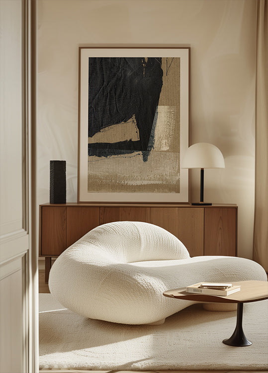 Say It af Dan Hobday er en abstrakt komposition i varme beige og brune nuancer. Organiske former møder markante penselstrøg og delikate lag, der skaber rolig dybde og grafisk spænding. Minimalistiske flader, mørke kontraster og bløde bevægelser inviterer øjet til at udforske værkets stille rytme. I neutrale, jordnære toner.