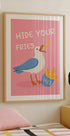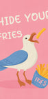 En skør og humoristisk illustration af en måge, der stjæler pommes frites, med den legende tekst “Hide Your Fries.” Denne farverige plakat bringer strandstemning og fræk charme ind i hjemmet og passer perfekt til køkkenet, børneværelset eller interiører, der omfavner humor og let design.