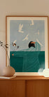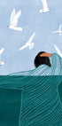 Dette kunstværk viser en eftertænksom skikkelse i stribet tøj nær havet. Måger svæver på himlen og skaber en fredelig kystscene. Den minimalistiske stil fremhæver temaer som ensomhed og natur. Perfekt til elskere af nautisk kunst.