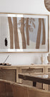 En stille vinter skildres i dæmpede beige og brune toner: slanke træstammer, et spejlblankt vand og en ensom silhuet, der søger ro i skovens dyb. Kompositionen er minimalistisk og afbalanceret, så øjet føres mod horisonten og den frosne sø. Et poetisk øjeblik af nærvær – af Little Dean. Farvepaletten er neutral og vinterlig.