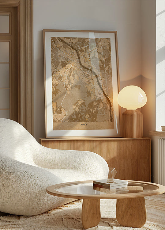 Dette sepiafarvede vintagekort over Bonn fanger byens sjæl med et smukt netværk af gader, kvarterer og den slyngende Rhinen, der deler landskabet. De varme toner og fine teksturer giver et nostalgisk, tidløst udtryk, perfekt til at fremhæve rejselyst, historie og urban elegance på væggen. Et stilfuldt fokuspunkt for enhver indretning.