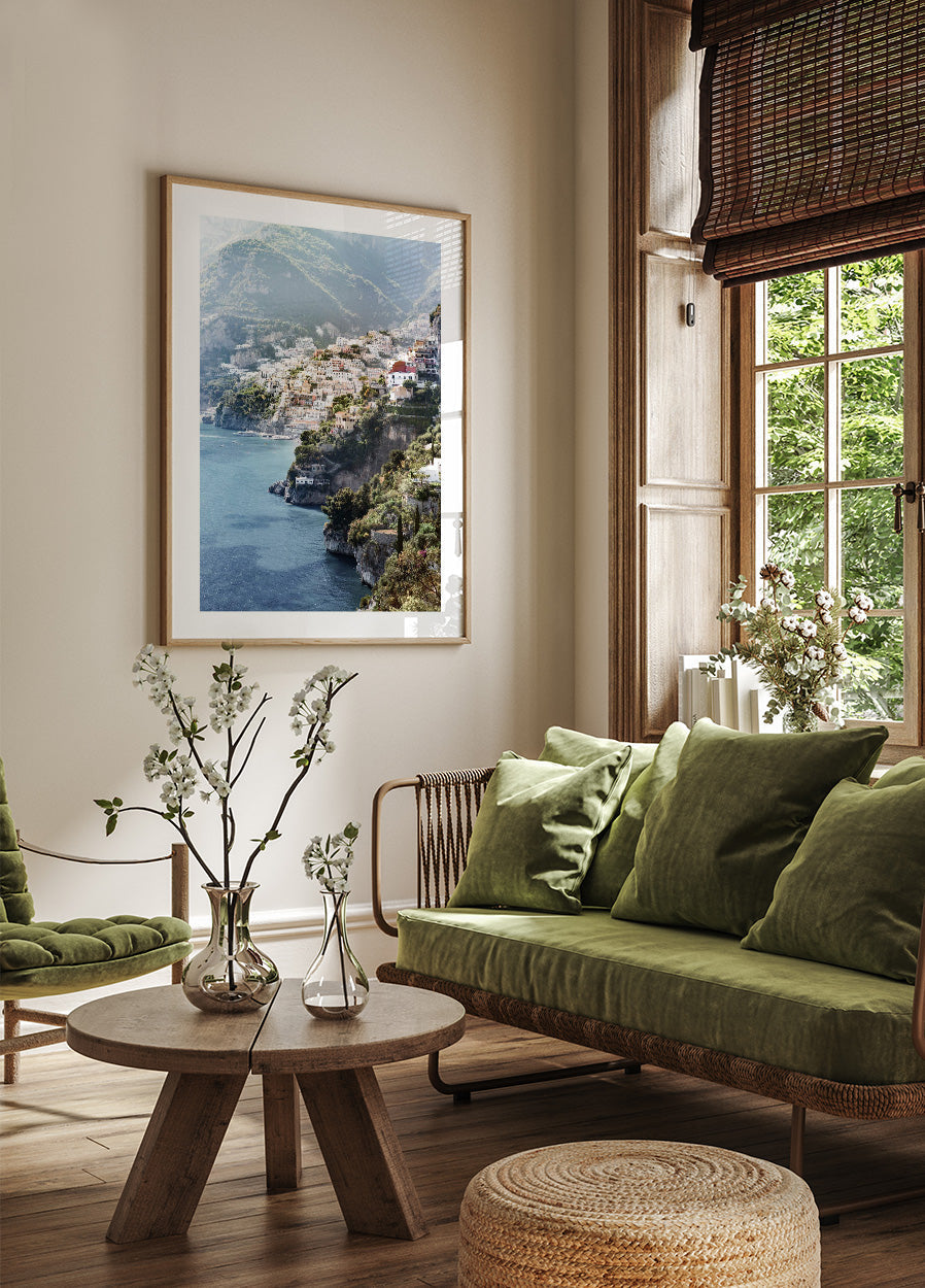 Plakaten viser en naturskøn kystlinje med en rigt bygget landsby beliggende på en klippe, omgivet af grønne bjerge og hav. Sollyset skaber en lys og varm atmosfære, mens det rolige hav reflekterer de omkringliggende bjerge. Dette billede fremstår som en idyllisk skildring af et malerisk italiensk kystområde.