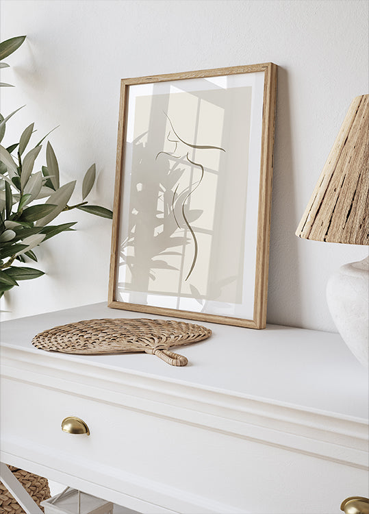 En minimalistisk og elegant line art-illustration, der viser de yndefulde kurver af en kvindes krop. Dette stilfulde og moderne kunstværk er perfekt til at tilføje et sofistikeret og kunstnerisk præg til ethvert rum. Ideel til moderne, skandinaviske eller boheme-inspirerede interiører, denne feminine silhuet bringer en følelse af skønhed og harmoni ind i dit hjem.