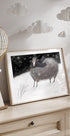 En drømmende vinterstemning folder sig ud i en poetisk illustration af Olga Skomorokhova: et blidt, uldt får træder frem i et frostklart landskab, hvor snefnug dæmper lydene og natten glimter svagt. Landlig ro og et strejf af humor giver motivet en varm, hyggelig aura – perfekt til nordisk, naturlig indretning.