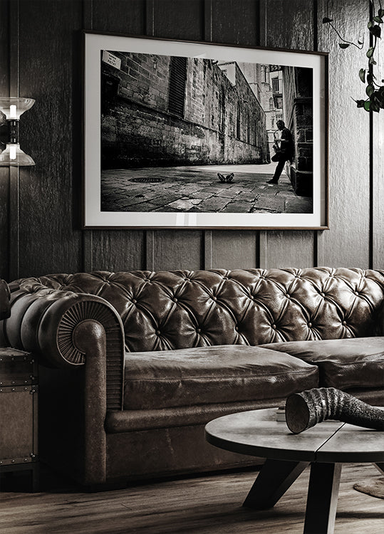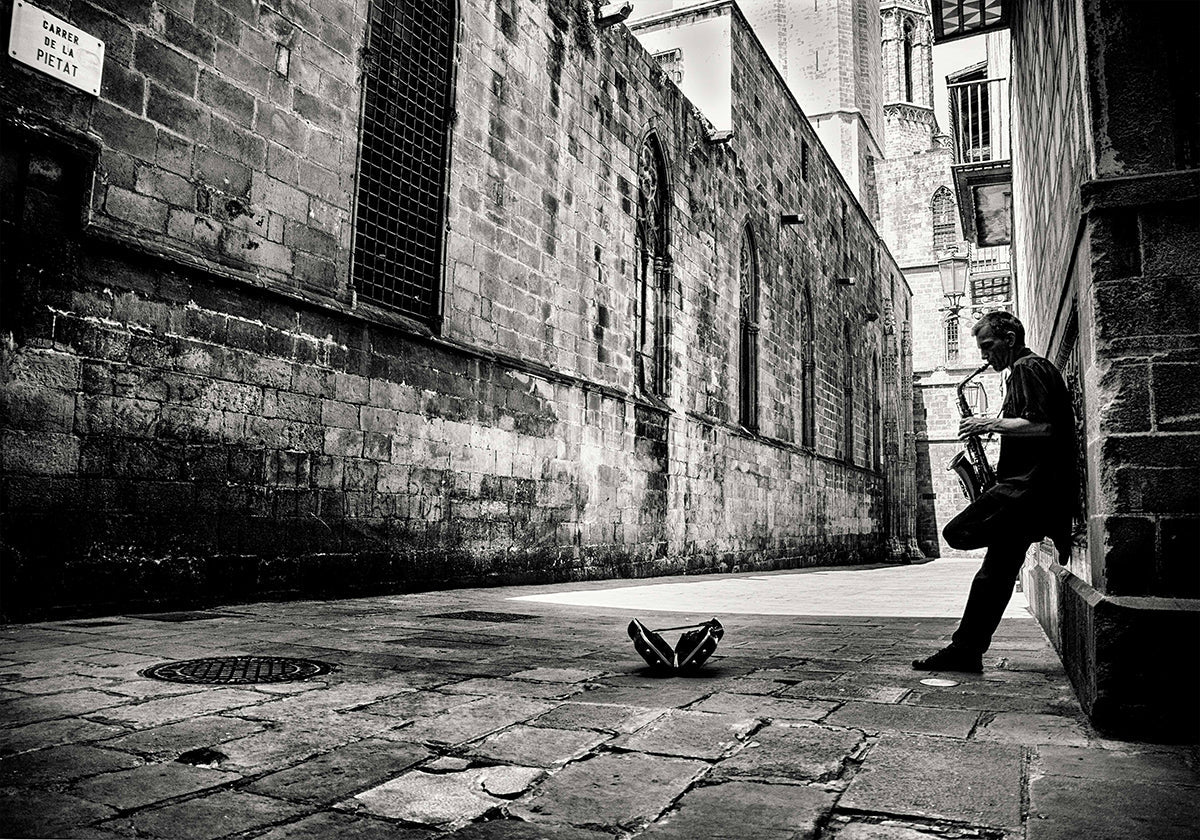 An evocative black-and-white city scene: a lone saxophonist pours jazz into a narrow Barcelona street, balconies and brick walls framing the hush. GertJan van Geerenstein captures the quiet pulse of urban solitude, where shadows, perspective, and lingering notes turn the alley into a stage. A cinematic hush hangs in the air.