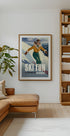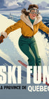En retroinspireret rejseplakat af Andreas Magnusson: En dynamisk skiløber i farverig parka skærer gennem puddersne ned ad pisten, mens Quebecs majestætiske bjerge og mørke fyrreskove rejser sig i baggrunden. Klare, grafiske former og dæmpede vintagefarver fanger den friske nordiske vinterstemning til eventyr.
