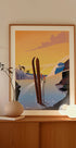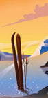 Ski Trip af Nicholas fanger roen før aftenløbet: snedækkede bjergsilhuetter spejler sig i en stille sø, mens skispor og oprejste stave antyder eventyr. Himmelens gradient fra varm orange til dyb lilla lægger et drømmende skær over landskabet og inviterer til vinterlig eskapisme. Perfekt til drømmere, rejselystne og alpine sjæle.