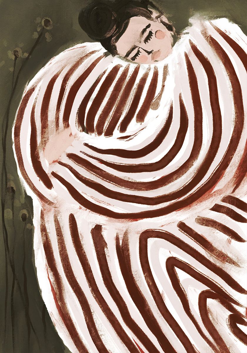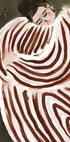 ovende prinsesse-plakaten indfanger den stille skønhed i en fredelig søvn, svøbt i en flydende kjole dekoreret med fejede, organiske striber i jordrød og blød hvid. Den drømmende, illustrative stil udstråler varme, komfort og en blid elegance, hvilket gør den til et perfekt statement til soveværelser, læsehjørner eller hyggelige opholdsrum. Den beroligende farvepalet og de bløde penselstrøg skaber en afslappende atmosfære, mens de udtryksfulde linjer tilfører et strejf af kunstnerisk raffinement. Ideel til gallerivægge eller som et enkeltstående kunstværk for dem, der værdsætter både charme og ro i indretningen.