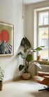 Snow Capped Mountain af Nicholas forener ro og drama i et minimalistisk bjerglandskab. En sneklædt top rejser sig i skarp silhuet mod en varm sol, mens en flok fugle glider gennem himlen. Japansk-inspirerede former og retrofarver i sort, rød og orange skaber en stilren, tidløs stemning. Perfekt til moderne indretning.