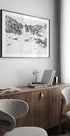 Snowy Mountain Peaks af Del Mundo Imagery fanger vinterens rå poesi: takkede, sneklædte tinder rejser sig over en stille dal, hvor mørke fyrreskove forsvinder i tåge. Det monokrome lys skærer skarpe konturer mellem sne og skygge og skaber en rolig, dramatisk stemning af fjern vildmark. Horisonten tegner sig i dis, og stilheden føles håndgribelig.