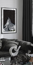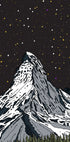 En snedækket bjergtop rejser sig skarpt mod en dyb, stjernestrøet nattehimmel. Klare, minimalistiske linjer og en centreret komposition skaber ro og balance, mens kølige blå toner møder varme nuancer ved horisonten. En stiliseret skov i forgrunden fuldender den alpine, drømmende stemning. Perfekt til ro i stuen eller soveværelset.