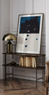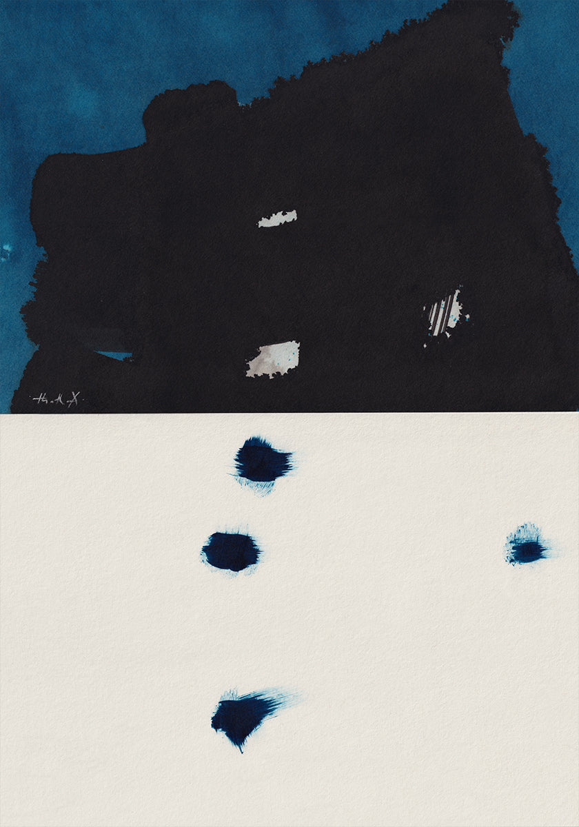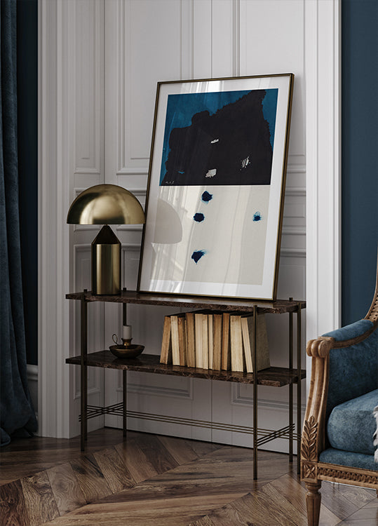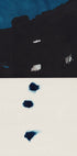 Step By Step af Thoth Adan skildrer en stille, japandi-inspireret bjergsti i sne og skumring. En lille vandrer bevæger sig op gennem de bløde, abstrakte former, hvor dybe blå og sort møder et roligt, dæmpet lys. Enkelte penselstrøg og zen-lignende balance giver motivet en meditativ, håbefuld retning. Fremad.