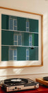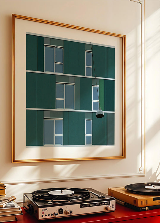 Street lamp af Inge Schuster indfanger urban minimalisme: en solitær lygtepæl tegner en skarp diagonal over hvide og bløde grå facader, brudt af et stille penselstrøg af grøn. Rene linjer, generøs negativ plads og subtile skygger skaber en afbalanceret, zen-agtig ro i et moderne byrum. Kompositionen indrammer byens stille poesi.