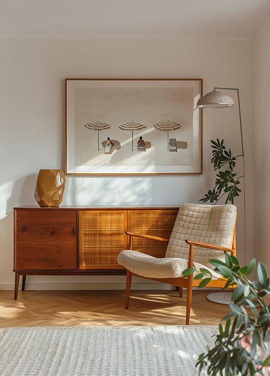 En rolig og enkel illustration med tre stribede parasoller og to personer i liggestole på en lys strand. De afdæmpede farver og afslappede komposition skaber en følelse af sommerro og middelhavsstemning. Perfekt til sommerhuse, moderne hjem eller gallerivægge.
