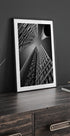 En monokrom byscene fra Amsterdam med dramatiske perspektiver, hvor slanke tårne og master skyder mod himlen. De grafiske linjer og skarpe kontraster skaber rytme og ro på samme tid, som sommerlyset tegner facaderne. En moderne, urban stemning afbildet af kunstneren willem. Perfekt til elskere af arkitektur og storbyliv.