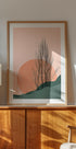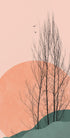 Et beroligende minimalistisk landskab, Sunset Serenity fanger naturens stille skønhed med slående enkelhed. Slanke, delikate træsilhuetter rejser sig mod en stor, varm orange sol, indrammet af bløde, bølgende grønne bakker og en bleg ferskenfarvet himmel. To små fugle svæver over og tilføjer en følelse af fred og åbenhed. Den afbalancerede komposition og den dæmpede farvepalette gør dette værk perfekt til moderne, skandinaviske eller Japandi-inspirerede indretninger og skaber et roligt fokuspunkt i ethvert rum.