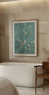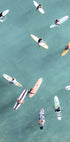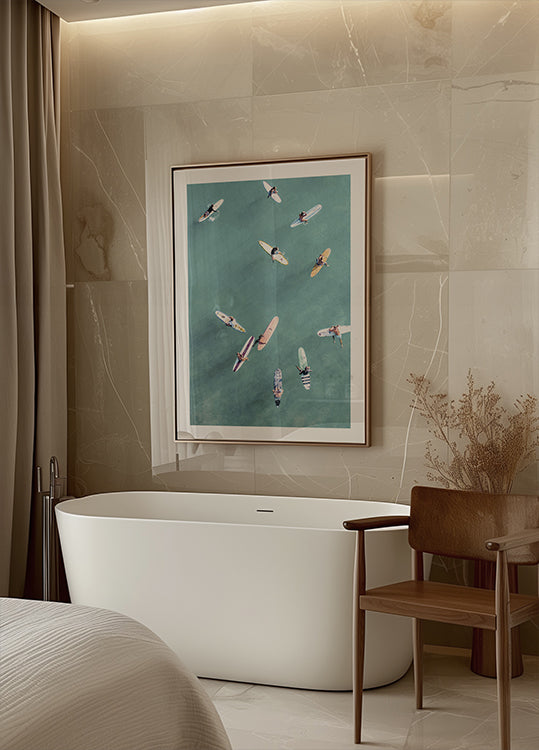 En forfriskende plakat set fra luften, der viser surfere, der flyder på turkist vand og venter på den næste bølge. Dette kystbillede bringer frihed, sol og sommerstemning til moderne hjem — perfekt til strandelskere.