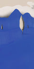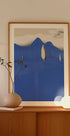 Et drømmende, surrealistisk landskab udfolder sig i dybe blå toner: lagdelte bjergsilhuetter, dis og fine skyer skaber en rolig, vinterlig stemning. Geometriske former møder bløde gradienter i en minimalistisk komposition, der giver rummet dybde og balance. Værket er af Little Dean. Perfekt som roligt fokuspunkt i moderne indretning.
