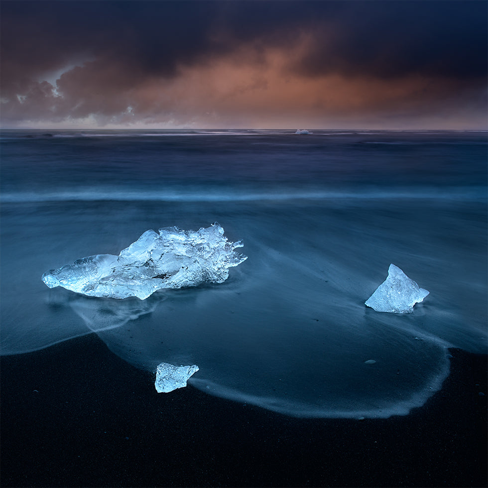 En stille, nordisk drøm af Shenshen Dou: På Islands barske kyst ved Jökulsárlón glitrer iskrystaller på sort sand, mens havet i lang eksponering tegner silkeagtige bølger mod horisonten. Koldt lys, dybe toner og grafiske kontraster skaber et roligt, tidløst blikfang til moderne rum. Perfekt til minimalistiske interiører.