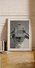 Et slående sort-hvidt modefotografi, der viser en kvinde, som holder et Vogue Italia-magasin foran ansigtet, iført en overdimensioneret halskæde og et tekstureret outfit. Kunstværket fanger mystikken og tiltrækningen fra modeverdenen, en blanding af anonymitet og dristig stil. Perfekt til moderne interiører og modeinspirerede gallerivægge.