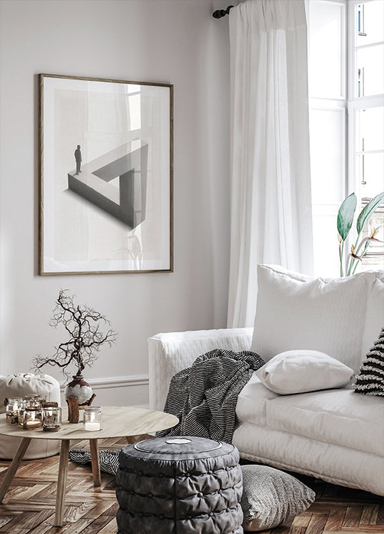 En konceptuel plakat med en mand på en Penrose-trekant – et umuligt objekt som repræsenterer paradoks og perception. Den enkle komposition og det tankevækkende motiv gør den ideel til moderne og filosofisk vægkunst.