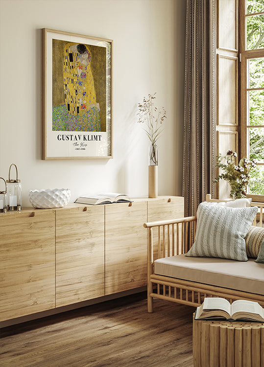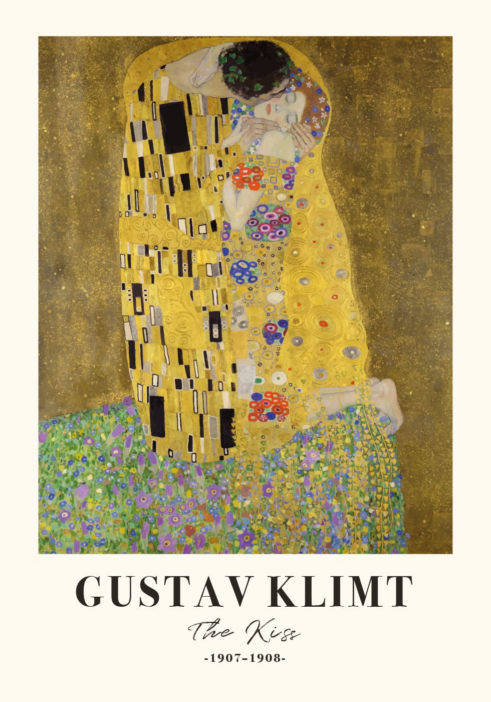 Gustav Klimts mesterværk *"Kysset"* er et betagende symbol på kærlighed og intimitet, skabt under hans Gyldne Periode. Dette ikoniske kunstværk viser et par i en kærlig omfavnelse, omgivet af gyldne mønstre og levende blomsterdekorationer. Med sine rige detaljer og bladguld er dette en af de mest hyldede symbolistiske kunstværker, der udstråler romantik og lidenskab.