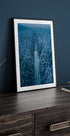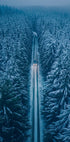 En ensom vintervej skærer gennem en mørk fyrreskov, indhyllet i tåge og blåligt skær. Langt fremme bryder billygter stilheden og leder blikket mod horisonten, hvor sne og dis mødes. Den stramme symmetri og melankolske ro indfanger rejsens længsel. Fotografi af Oskar Ulvur. Perfekt til dig der elsker stille vinterlandskaber.