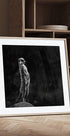 En vagtsom surikat står oprejst som savannens lille vagtpost, fanget i et dramatisk sort-hvidt øjeblik. Det bløde sidelys fremhæver pelsens tekstur og de skarpe konturer, mens baggrunden falder i mørke. Et minimalistisk, tidløst dyreportræt fotograferet af Greetje van Son. Fokus på blikket giver motivet ro og nærvær.