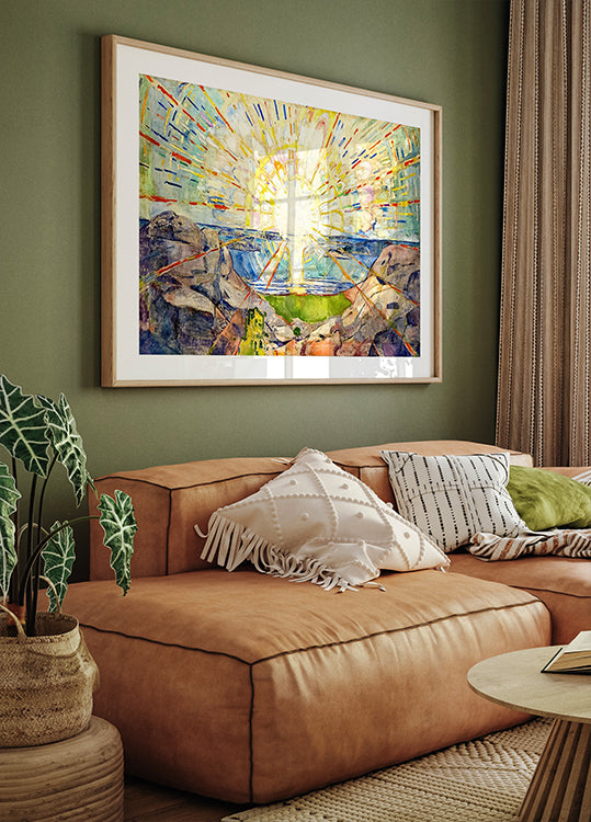 Et strålende mesterværk af Edvard Munch, "Solen" (1909), der skildrer en betagende solopgang over et klippefyldt norsk landskab. Kraftige lysstråler strømmer fra den centrale sol og fylder himlen med levende farver og dynamisk energi. Munchs ekspressive stil indfanger både naturens storhed og den dybe symbolik omkring fornyelse og liv. Et ikonisk værk inden for moderne kunst, perfekt til Munch-elskere og landskabsentusiaste