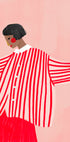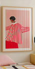 Stiliseret illustration af en figur i et dristigt rød- og hvidstribet outfit mod en blød lyserød baggrund, der indfanger essensen af moderne modekunst. Det minimalistiske design og de levende farver tilfører dynamisk elegance til dette samtidskunstværk.
