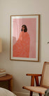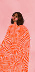 En kvinde svøbt i en flydende, livlig orange mønstret kappe mod en blød lyserød baggrund. Denne moderne illustration indfanger varme og stil med et minimalistisk og abstrakt udtryk, perfekt til elskere af samtidskunst, der søger inspiration.