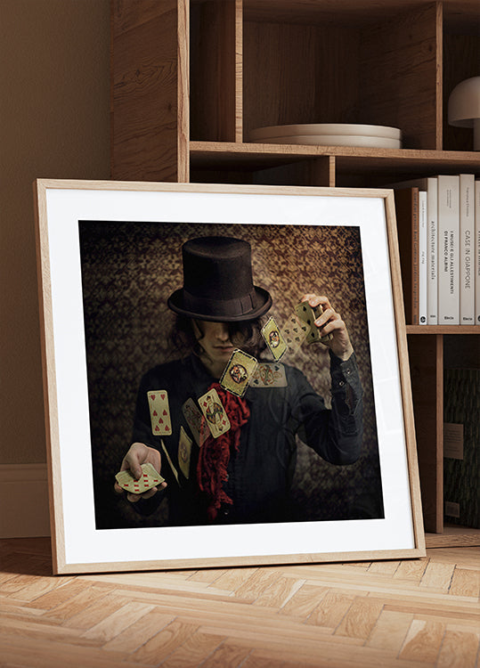 Try your fortune af Kiyo Murakami skildrer en mystisk illusionist i hat, fanget mellem skygger og glimt af magi. Spillekort hvirvler omkring ham, mens symboler som hjerter, ruder, klør og spar antyder skæbnens spil. En vintage, slidt æstetik møder futuristisk flair og vækker nysgerrighed. Den lover et strejf af mystik i hjemmet.