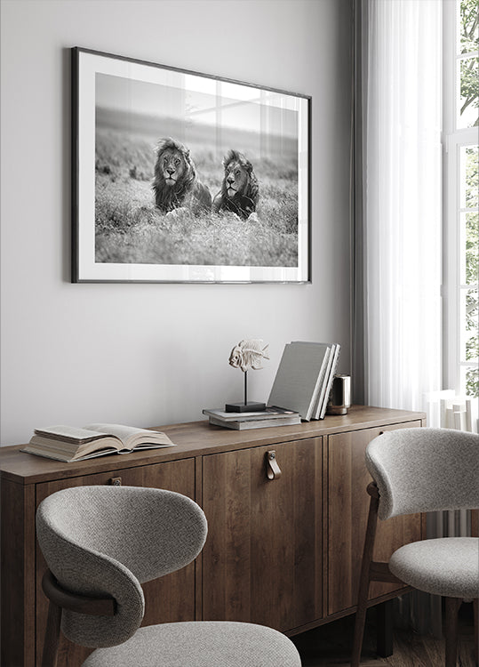 To majestætiske hanløver hviler side om side i den vindfejede savanne, mankerne stryger i blæsten og blikkene er rolige, men årvågne. Den sort-hvide komposition fremhæver styrke, nærvær og vild skønhed – et tidløst safariøjeblik fra Serengeti, fotograferet af Nicolás Merino. Deres tætte bånd og kongelige ro kan mærkes.