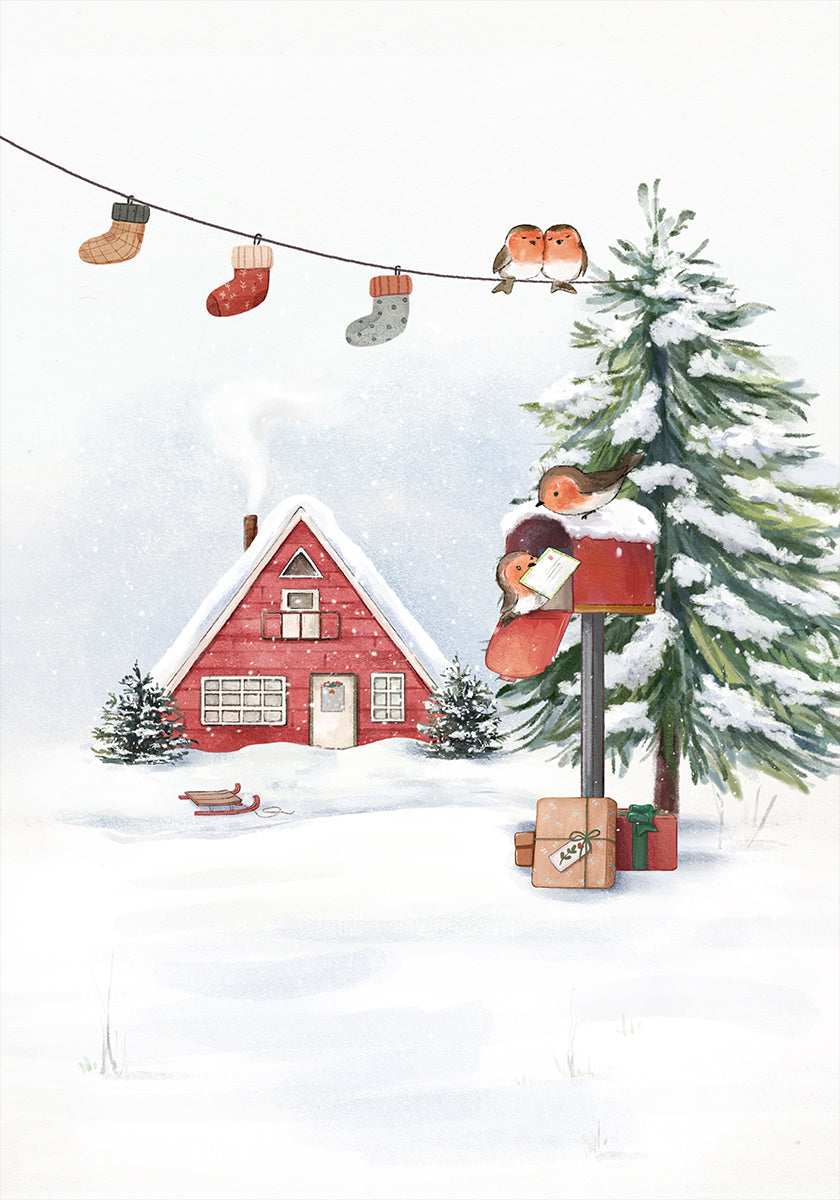 En hjertevarm vinterplakat af Xuan Thai: Små, nuttede fugle samles i sneen omkring et rødt hus, mens stjerner glitrer over et pyntet juletræ. Blide farver og legende detaljer spreder julestemning og ro – perfekt til børneværelset, stuen eller som hyggelig sæsonpynt. Et charmerende motiv, der gør sig lige godt i entréen og som gave i juletiden.