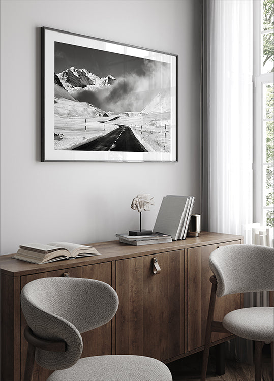 Venturing into the unknown af Alfredo Costanzo indfanger en dramatisk, sort-hvid rejse gennem et alpelandskab. En ensom vej fører mod et lille hus, mens tåge og sne omslutter de stejle bjerge. Kontrasterne skaber ro og spænding på samme tid—en poetisk hyldest til vinter, stilhed og mod. Perfekt til elskere af minimalisme, natur og eventyr.