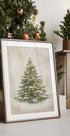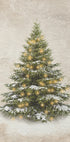 Et hyggeligt, eviggrønt træ i vintage-stil står let drysset med sne, mens varme gyldne lys glimter mellem grenene. Den afdæmpede, papir-teksturerede baggrund og blidt snefald giver en rolig og nostalgisk juleatmosfære—ideel til en klassisk sæson-gallerivæg eller et enkelt vinterhjørne.