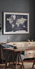 Et detaljeret verdenskort i retrostil, skabt af Rosana Laiz Blursbyai. Mørkeblå og taupe toner møder subtil tekstur og typografi, mens ordet “Wanderlust” sætter scenen for eventyr. Markerede lande og bynavne inviterer til drømme, planlægning og nostalgiske minder om steder, du elsker. Perfekt til stue, kontor eller kortvæg.