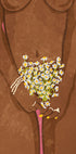 Daisy Bloom Nude Plakat er en dristig, men poetisk illustration, der fejrer femininitet, selvkærlighed og naturlig skønhed. Den viser en nøgen kvinde med brun hud, der holder en sart buket hvide margueritter. Værket kombinerer varme jordtoner med en livlig lyserød teksturbaggrund, og de detaljerede smykker og den friske blomsterbuket fremkalder temaer om styrke, blidhed og sensualitet. Et kraftfuldt statement til moderne interiører, kunstgallerier eller intime rum.
