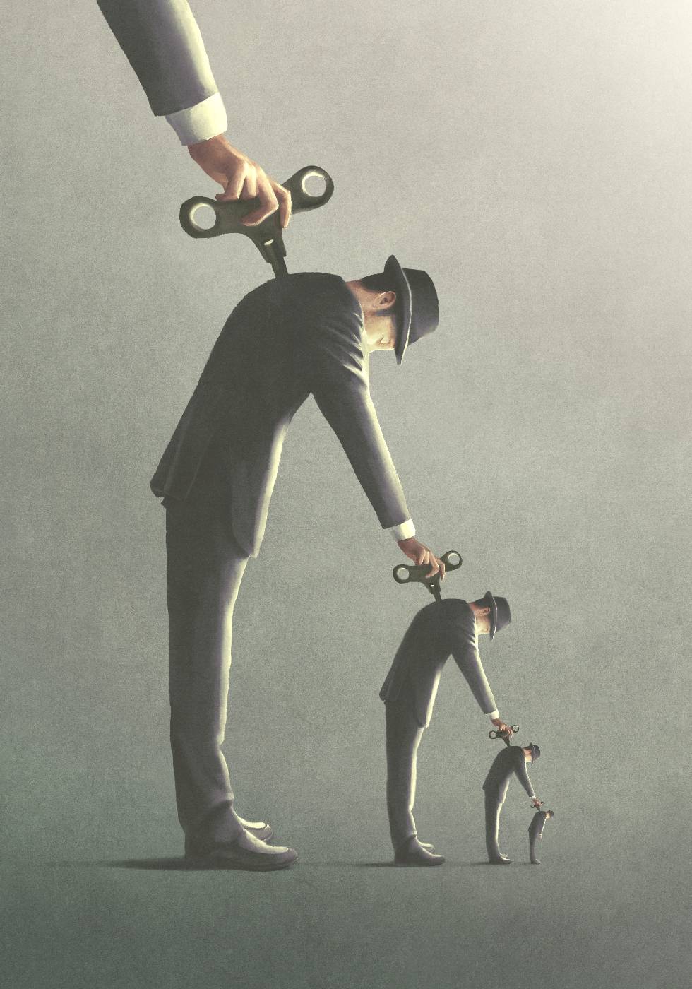 En visuel fortælling om mænd i en endeløs kæde, der trækker hinanden op med optræksnøgler. Værket stiller spørgsmål ved menneskets frihed i et system præget af rutine og forventning.