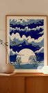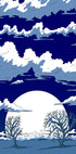En stemningsfuld vinterplakat af Nicholas: et minimalistisk, måneoplyst landskab i dybe blå toner. Nøgne træer står som silhuetter mod en dramatisk, skyfuld nattehimmel, hvor en stor fuldmåne spejler sig i den frosne jord. Rolig, poetisk og perfekt til at skabe ro i stue, soveværelse eller kontor. Et stilrent blikfang.