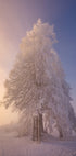 En stille vintermorgen folder sig ud i et landskab badet i gyldent morgenlys. Rimfrost glitrer på græs og grene, mens en ensom træsilhuet står skarpt mod den klare himmel. Sneen dæmper hvert spor, og luften sitrer af kulde og ro. Fotografiet er skabt af Judith Kuhn. Solens stråler bryder gennem rimklædte grene og giver motivet en poetisk ro.