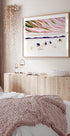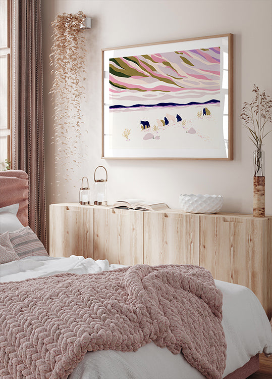 Et dramatisk vinterlandskab i dæmpet navy, rosa og lilla toner, hvor en flok ulve bevæger sig gennem sneen mod fjerne bjergtinder under en rolig solnedgang. Julie Lesouefs gouache-illustration forener styrke og poesi og giver rummet en følelse af ro, vildskab og nordisk magi. En stemningsfuld vægkunst, der inviterer til fordybelse.